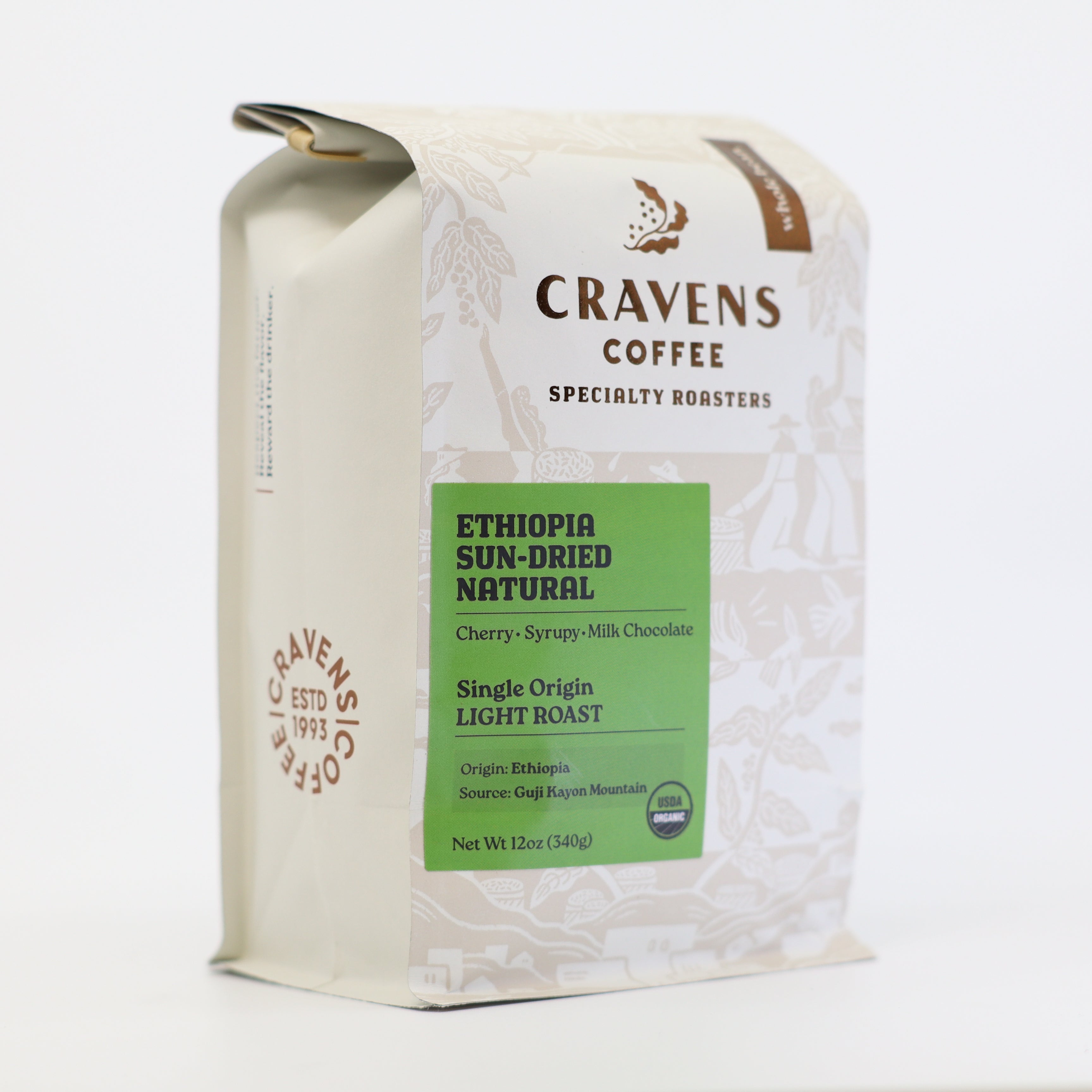 A standout crop from the Kayon Mountain Farm in Ethiopia’s forest-rich Guji Zone, grown at elevations up to 6,900 feet and sun-dried on raised beds, this organic single origin delivers a vibrant, candy-like sweetness with layers of depth and character.